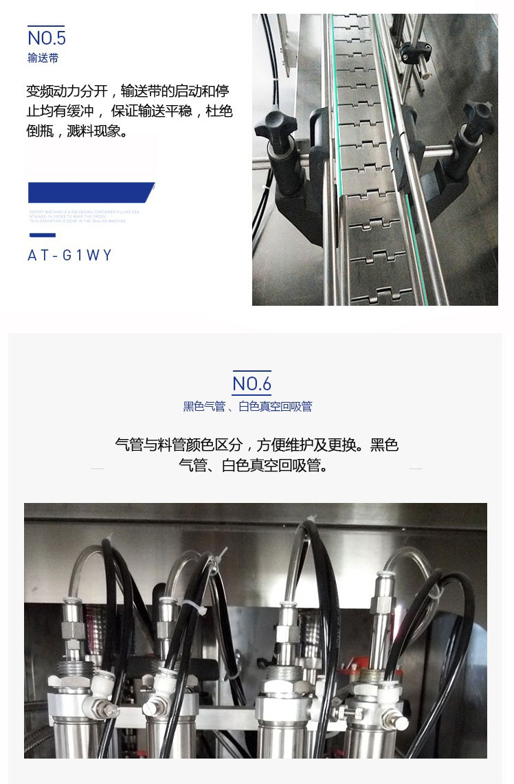 該六頭柱塞式全自動潤滑油灌裝機特的灌裝頭設(shè)計及真空回吸系統(tǒng),確保灌裝過程無殘油滴漏,快慢雙速灌裝,灌裝速度可調(diào),杜絕溢瓶現(xiàn)象。該機采用動力灌裝,無需配裝高位罐,簡化了安裝工序,提高了灌裝效率。履帶式壓蓋機,穩(wěn)定無噪音,無空壓現(xiàn)象。觸摸屏界面友好,操作簡捷,SIEMENS PLC控制系統(tǒng),運算速度快,性能穩(wěn)定,品質(zhì)卓越。電、氣件均采用精品元件,確保整機運作穩(wěn)定。