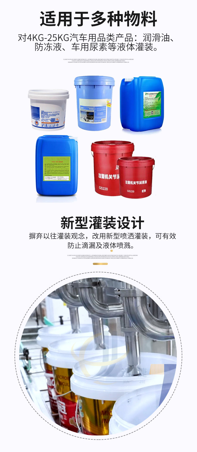 全自動稱重式灌裝機適用于多種物料,對4kg-25kg汽車用品類產(chǎn)品:潤滑油、防凍液、車用尿素等液體灌裝。