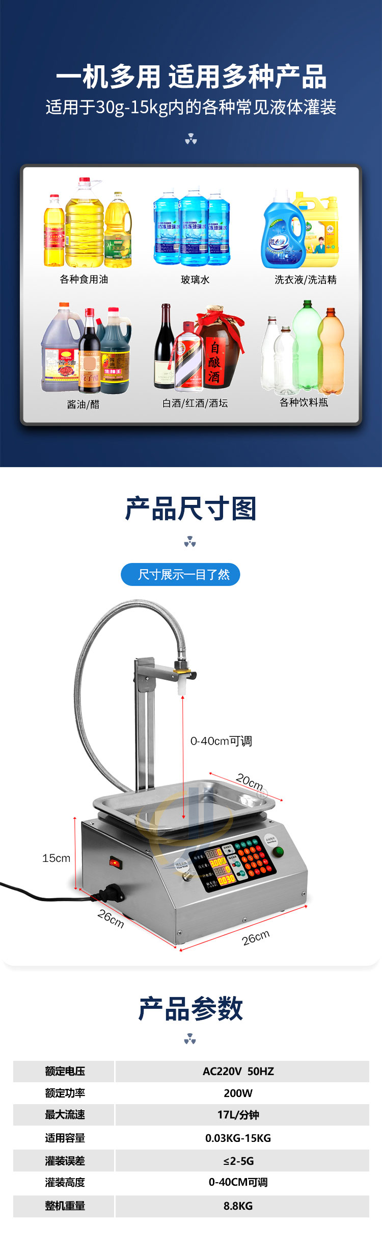 稱重式液體灌裝機(jī)適用于30g-15kg內(nèi)的各種常見(jiàn)液體灌裝。采用精度高,反應(yīng)靈敏的電子秤作為計(jì)量標(biāo)準(zhǔn)。其性能可以超越所有時(shí)間定量的方式。