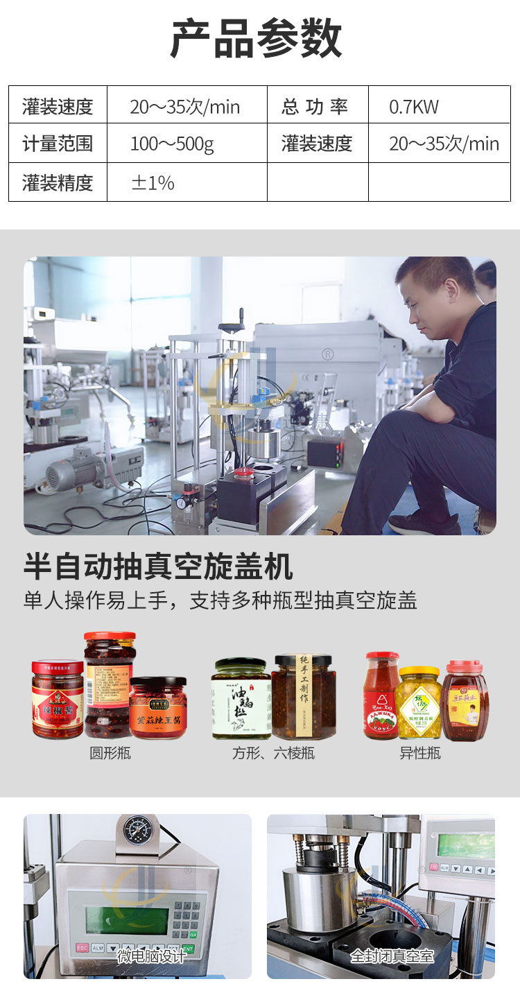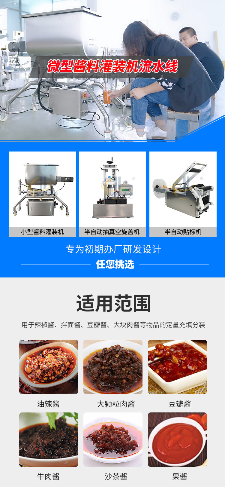 小型醬料灌裝生產(chǎn)線又名醬料灌裝三劍客,由半自動醬料灌裝機(jī)+半自動真空旋蓋機(jī)+半自動圓瓶貼標(biāo)機(jī)組合而成。該灌裝機(jī)適用于辣椒醬、豆瓣醬、大塊肉醬等物品的定量充填分裝。
