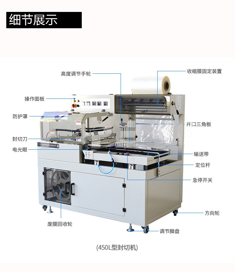 配合L型封切刀使收縮膜包裝一次封切成型,鍍特氟龍不粘層封口布,封切不黏膜,且封口整齊不開裂,產(chǎn)品經(jīng)封切后,進(jìn)入自動(dòng)塑料膜熱收縮包裝機(jī)完成包裝。