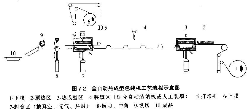 包裝的全過稅由機器自動完成,根據(jù)需要,裝填可采用人工或機械實現(xiàn)。內(nèi)流程圖可見,下卷膜經(jīng)牽引以定步距步進(jìn),經(jīng)預(yù)熱區(qū)及加熱區(qū),由氣壓、真空或沖模成型,在裝填區(qū)填充物料后進(jìn)入熱封區(qū)。在熱封區(qū)中,上卷膜經(jīng)導(dǎo)輥后覆蓋在成型盒上,視包裝需要可進(jìn)行抽真空或充入保護(hù)氣體的處理,然后進(jìn)行熱壓封合。后經(jīng)橫切、縱切及切角修邊形成一個個美觀的包裝成品。至于經(jīng)裁切后的邊料可由抽吸捅或卷揚裝置收集和清理。